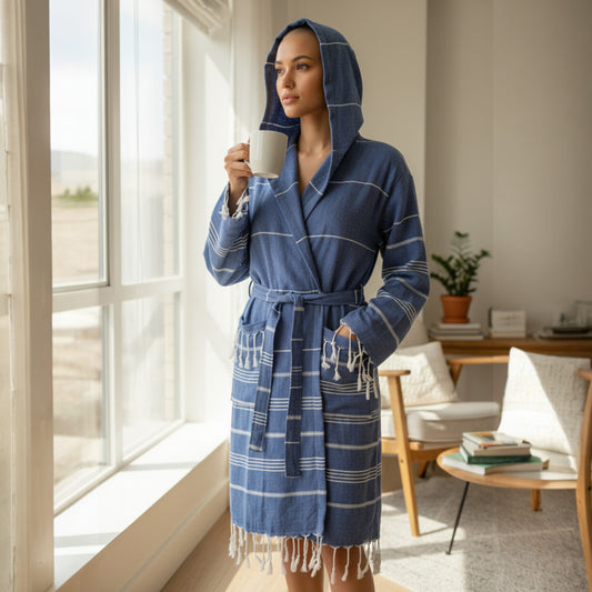 Bademantel mit Kapuze & Fransen aus Baumwolle – Blau – One Size – Paraguay