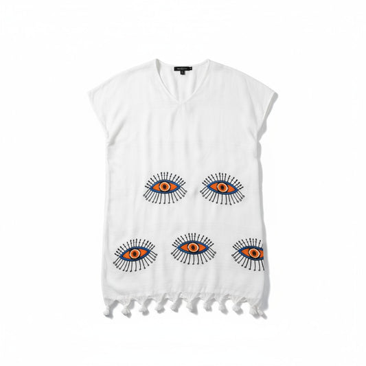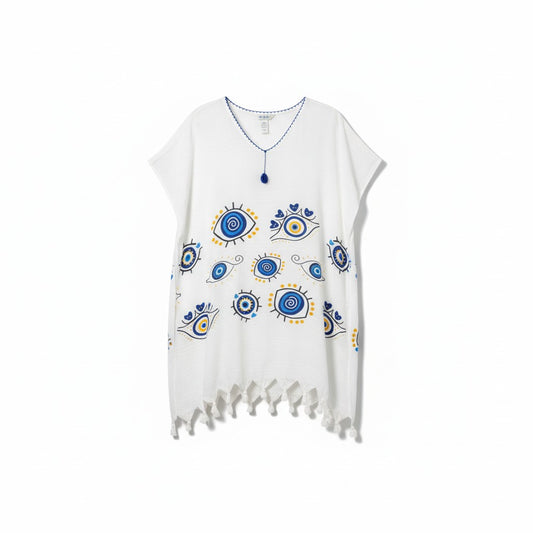 Weißer Bambus-Kaftan mit Augenmuster & Fransen – Boho Strandkleid – One Size