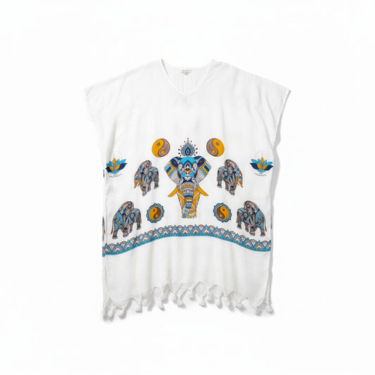Weißer Bambus-Kaftan / Kimono mit Elefanten-Print & Fransen – Boho Strandkleid – One Size